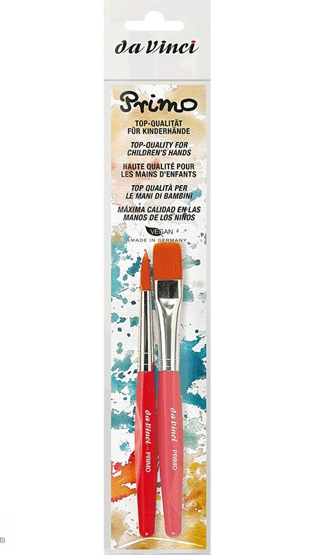 Setul de pensule Primo pentru copii este format dintr-o pensulă plată și una rotundă, ambele având peri sintetici „indestructibili” și mânere scurte și practice, care se potrivesc perfect în mâinile copiilor.